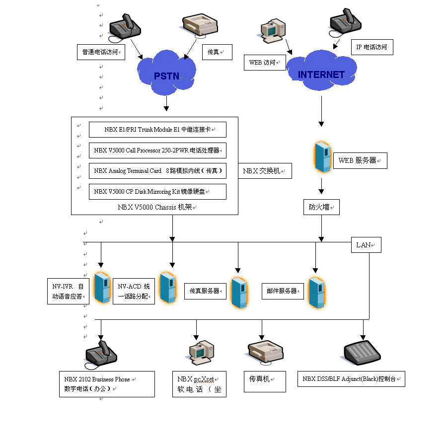 北京晨報的客戶服務中心項目是一個集呼叫中心與辦公系統(tǒng)于一體的語音、數(shù)據(jù)服務平臺。通過一條E1中繼線與外部電話網(wǎng)相聯(lián)。內(nèi)部使用50部數(shù)字電話進行處理辦公業(yè)務,10個呼叫中心坐席采用計算機的軟電話(pcXset)實現(xiàn)與客戶的交談,傳真服務器通過NBX所提供的8條模擬內(nèi)線與外界互通。