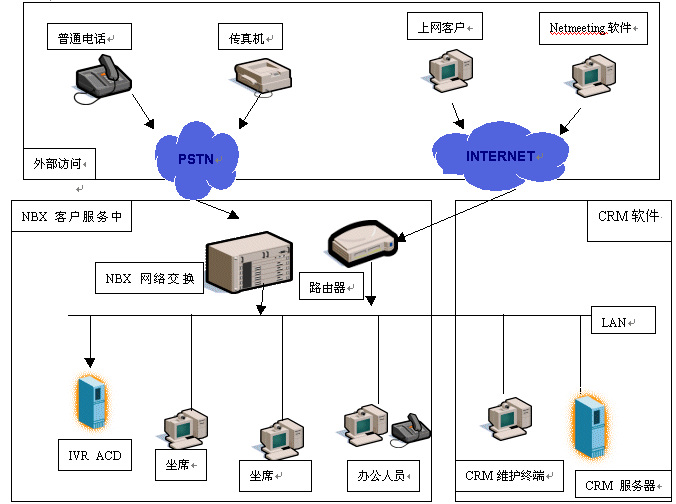 NBX客戶服務(wù)中心特有的分布式呼叫中心的架構(gòu),對(duì)于分布式于不同地區(qū)辦公的大型企業(yè)應(yīng)用CRM起到了良好的訪問(wèn)支持平臺(tái)。NBX客戶服務(wù)中心是語(yǔ)音、數(shù)據(jù)兩網(wǎng)合一,通過(guò)以太網(wǎng)傳輸,于是在異地之間的各個(gè)呼叫中心之間可以實(shí)現(xiàn)語(yǔ)音數(shù)據(jù)的同步溝通。CRM軟件所要傳輸?shù)臄?shù)據(jù)可以通過(guò)服務(wù)中心網(wǎng)絡(luò)傳輸,既節(jié)約了布線成本,降低了網(wǎng)絡(luò)維護(hù)費(fèi)用,又提高了語(yǔ)音數(shù)據(jù)的同步。