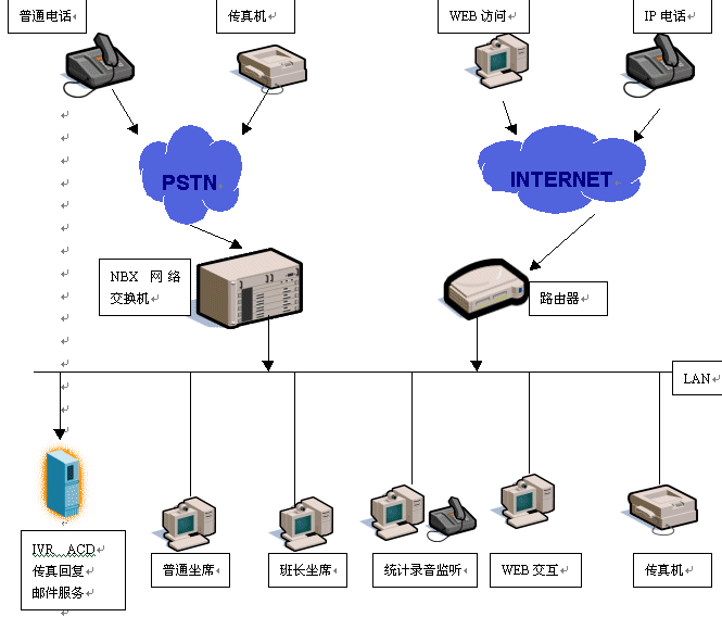 基于NBX的呼叫中心對外支持PSTN、IP兩種接入方式,可以實(shí)現(xiàn)各種接入:普通電話、傳真、IP電話、郵件、WEB訪問,NBX呼叫中心在技術(shù)上實(shí)現(xiàn)革命性的突破,在內(nèi)部實(shí)行語音數(shù)據(jù)兩網(wǎng)合一,從而實(shí)現(xiàn)外部各種訪問的統(tǒng)一路由分配。