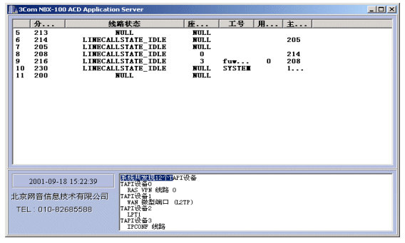 NBX呼叫中心的核心設(shè)備是3Com公司的NBX網(wǎng)絡(luò)交換機(jī),NBX網(wǎng)絡(luò)交換機(jī)支持開放式電話開發(fā)平臺TAPI2.X,TAPI它是Microsoft電話技術(shù)應(yīng)用程序編程界面標(biāo)準(zhǔn),運(yùn)用TAPI可以方便、高效地完成針對語音線路的控制開發(fā),從而完成自動語音應(yīng)答(IVR)、自動話路分配(ACD)、以及坐席接待、計(jì)費(fèi)、錄音等需求。使用TAPI這種標(biāo)準(zhǔn)使得用戶可以集成第三方CTI程序以完成各種高級需求。