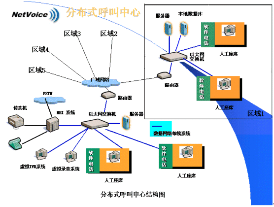 由于代理技能差異、語言差異、呼叫量的差異,以及客戶中心客戶所在地的變化及每個客戶對各自所擁有的用戶資料的保密性需求,分布式呼叫中心往往更適合各類企業(yè)的實(shí)際。分布式呼叫中心的建立,意味著需要在多個分中心之間進(jìn)行統(tǒng)一的呼叫控制及語音與同步數(shù)據(jù)轉(zhuǎn)移。NBX網(wǎng)絡(luò)交換機(jī)的引入,兩網(wǎng)合一的特性使分布式呼叫中心的建立成為了一件非常容易的事情。呼叫中心可以擴(kuò)展到多個位于不同地域的局域網(wǎng)上,通過路由選擇可以自動地把呼叫(