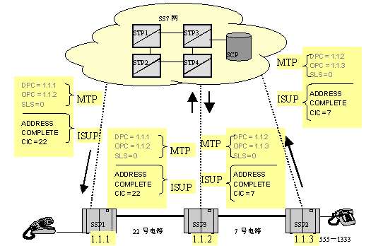 如下圖所示,當(dāng)一個(gè)用戶摘機(jī)并拔被叫號(hào)碼,交換局(SSP1)收集并分析被叫號(hào)碼,分析到被叫不是本局內(nèi)用戶,而是目的信令點(diǎn)編碼為1.1.3交換局的用戶,于是,SSP1在路由表中查找到達(dá)1.1.3的路由,然后用找到的鏈路把IAM消息發(fā)送出去,如圖中箭頭所示。