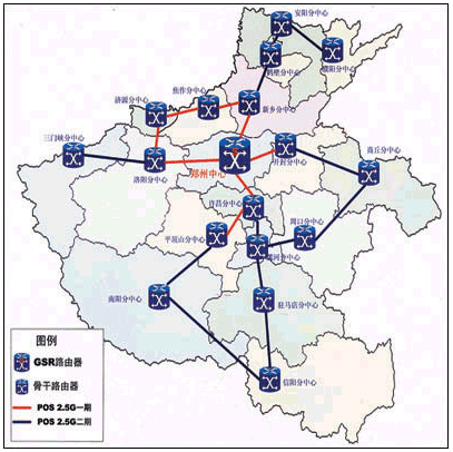 HERNET一期工程主干網(wǎng)采用IP POS技術(shù),應(yīng)用AVVID網(wǎng)絡(luò)體系結(jié)構(gòu),采用骨干傳輸網(wǎng)、城域網(wǎng)、接入網(wǎng)三層設(shè)計方案,以省網(wǎng)絡(luò)中心(設(shè)在鄭州大學(xué)網(wǎng)絡(luò)中心)、地市網(wǎng)絡(luò)中心、校園網(wǎng)三級管理模式。由省網(wǎng)絡(luò)中心向下以2.5G速度連接到各地市網(wǎng)絡(luò)中心,而向上則以155M速度連接到CERNET及Internet。整個一期工程實現(xiàn)了包括鄭州、許昌、平頂山、開封、洛陽、濟源、焦作以及新鄉(xiāng)等7個地市的2.5G連接,并形成了一個環(huán)網(wǎng)狀冗余拓撲結(jié)構(gòu),確保當網(wǎng)絡(luò)的一個節(jié)點出現(xiàn)問題時,數(shù)據(jù)可以通過其他途徑傳輸?shù)侥康牡兀谝黄诠こ掏瓿珊,?0多所大學(xué)、中小學(xué)等教育與科研單位以千兆速度連接到HERNET上,共有近50萬的用戶能夠充分利用高速帶寬獲得教育網(wǎng)資源。