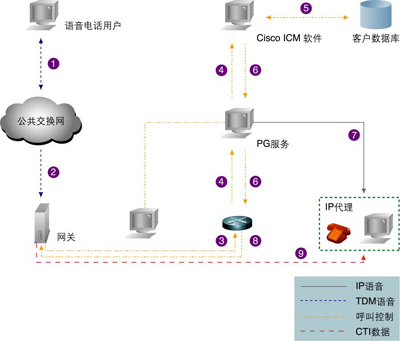 (1)一個(gè)客戶通過PSTN發(fā)出一個(gè)基于TDM平臺(tái)的呼叫。(2)企業(yè)聯(lián)絡(luò)中心的VoIP網(wǎng)關(guān)收到這一呼叫,并把它從TDM形式轉(zhuǎn)換為IP形式。(3)該VoIP網(wǎng)關(guān)發(fā)出一個(gè)路由申請(qǐng),包括撥號(hào)號(hào)碼等給Cisco