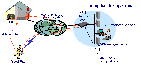 如上圖所示,企業(yè)網(wǎng)絡(luò)中心利用VPNManager建立全網(wǎng)的LDAP認(rèn)證目錄服務(wù)系統(tǒng)或使用RADIUS認(rèn)證系統(tǒng),當(dāng)遠(yuǎn)程用戶接入本地的ISP之后需要訪問企業(yè)網(wǎng)內(nèi)部的資源時(shí),安裝在移動用戶計(jì)算機(jī)上VPNremote Client即登錄網(wǎng)絡(luò)中心的LDAP服務(wù)器或RADIUS服務(wù)器進(jìn)行驗(yàn)證工作,通過后即可訪問相應(yīng)權(quán)限的資源。然后遠(yuǎn)程主機(jī)通過Internet發(fā)送加密信息到企業(yè)網(wǎng)絡(luò)中心的VPN設(shè)備;當(dāng)數(shù)據(jù)包到達(dá)目標(biāo)VPN設(shè)備時(shí),數(shù)據(jù)包被解封裝,數(shù)字簽名被核對無誤后數(shù)據(jù)包被解密。