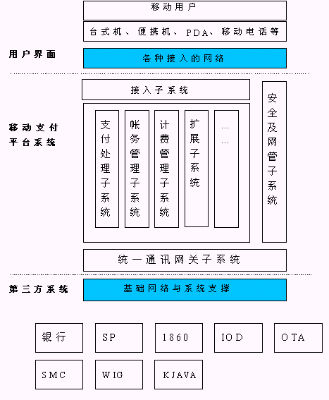 3、 移動支付平臺可以支持多種支付方式,如信用卡、儲值卡、小額支付等;平臺本身具備一小額儲值卡平臺,用于移動業(yè)務(wù)和ICP業(yè)務(wù)支付等;