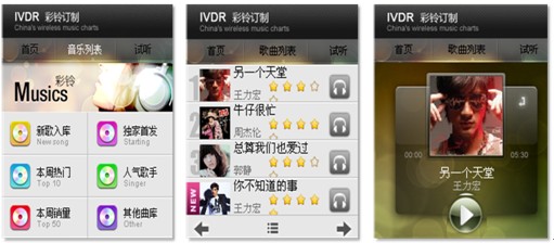 6)彩鈴定制業(yè)務(wù)。傳統(tǒng)彩鈴定制業(yè)務(wù)基于純語(yǔ)音IVR的環(huán)境下使用起來(lái)非常繁瑣,進(jìn)行彩鈴檢索比較麻煩,選擇的準(zhǔn)確度也很低。手機(jī)客戶(hù)端軟件的應(yīng)用,提供了可視化的交互方式,讓業(yè)務(wù)使用起來(lái)直觀便捷很多。用戶(hù)通過(guò)聲動(dòng)魅力完成彩鈴信息的瀏覽、試聽(tīng)、定制過(guò)程,用戶(hù)可以邊瀏歌曲的同時(shí)邊聽(tīng)到語(yǔ)音對(duì)歌曲的介紹,并可試用該歌曲。下圖即為彩鈴定制業(yè)務(wù)操作界面: