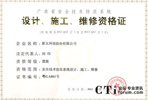 CTI論壇(ctiforum)1月31日消息(記者 浩宇):近日,新太科技股份有限公司再傳喜訊,公司順利通過廣東省公安廳認(rèn)定的“廣東省安全技術(shù)防范系統(tǒng)設(shè)計(jì)、施工、維修一級資格證”換證審核,成功獲得新證書。此次新太科技資質(zhì)認(rèn)證的通過,是新太科技公司全體員工通過兩年的不斷努力得到的豐碩成果,她不僅體現(xiàn)了新太科技安防技術(shù)等級在行業(yè)內(nèi)處于領(lǐng)先的優(yōu)勢,同時也體現(xiàn)出新太科技的管理和服務(wù)水平實(shí)現(xiàn)了行業(yè)內(nèi)的完美延續(xù)。