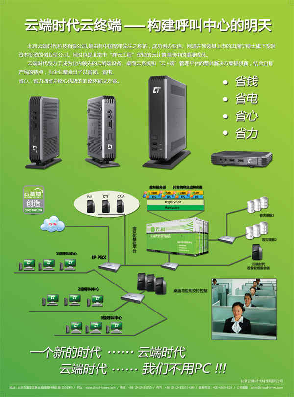 云端時代是由有中國寬帶先生之稱的,成功創(chuàng)辦亞信、網(wǎng)通并帶領其上市的田溯寧博士旗下寬帶資本投資的創(chuàng)業(yè)型公司。同時也是北京市“祥云工程”計劃資助的云計算基地中的重要成員。 云端時代致力于成為業(yè)內(nèi)領先的云終端設備、桌面云系統(tǒng)和“云+端”管理平臺的整體解決方案提供商,幫助中國企業(yè)向 “云+端”架構轉(zhuǎn)型。 云端時代的管理團隊由具有國際化背景和本地化經(jīng)驗的優(yōu)秀人才構成,核心成員來自國內(nèi)外知名的瘦客戶機設備廠商、嵌入式芯片廠商、集成電路企業(yè)以及通訊企業(yè)等。如:AMD、聯(lián)想、威盛、升騰、Wyse、控創(chuàng)等等。