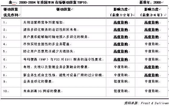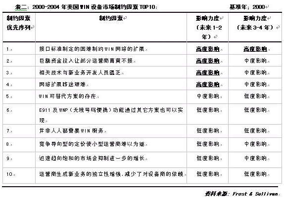 美國(guó)的WIN市場(chǎng)盡管處于強(qiáng)勢(shì)發(fā)展過程中,但這其中的變數(shù)也是有的。根據(jù)Frost & Sullivan 資料,2000-2004年間制約該市場(chǎng)發(fā)展的主要因素與影響力度見表二: