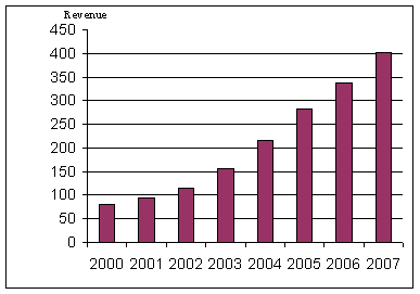 圖1表明了2000年至2007年亞太新一代移動網(wǎng)絡(luò)市場的收入與增長。