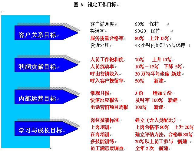 | 1 | 分4批招聘100位新員工,滿足話務量增長的需要 | 接通率90% 上崗合格率80% 工作飽和度70% |