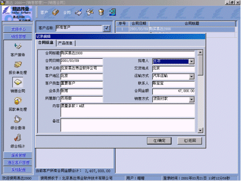 北京易達偉業(yè)軟件技術有限公司是由一群年輕的知識型創(chuàng)業(yè)者及投資機構共同投資創(chuàng)立的,正式成立于1999年10月,是國內較早進行CRM軟件專業(yè)研發(fā)和推廣的領導廠商之一。