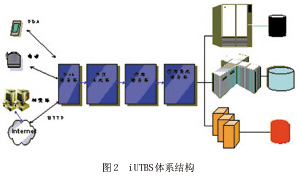 iUTBS的體系結(jié)構(gòu)與電子商務(wù)系統(tǒng)的體系結(jié)構(gòu)是一致的,服務(wù)器由4級結(jié)構(gòu)組成; Web服務(wù)器、動態(tài)網(wǎng)頁生成器、應(yīng)用服務(wù)器、應(yīng)用集成服務(wù)器。如圖2所示。