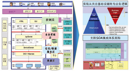 在企業(yè)應用集成上,產品采用了面向服務的組件化設計,遵循SOA體系架構,既支持基于服務的企業(yè)IT系統在數據、服務、流程等各個層面有效協同,也支持對各種遺留系統采用各種傳統的接口方式進行集成。