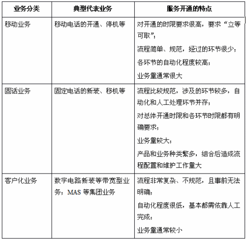 同時(shí)全業(yè)務(wù)運(yùn)營(yíng)也帶來(lái)了許多新的服務(wù)開(kāi)通方面的需求。首先,全業(yè)務(wù)運(yùn)營(yíng)環(huán)境下,運(yùn)營(yíng)商為了更快地占領(lǐng)市場(chǎng)和吸引客戶(hù),會(huì)推出大量的套餐和捆綁組合產(chǎn)品,這就會(huì)引發(fā)流程和環(huán)節(jié)同步的需求,包括多個(gè)環(huán)節(jié)同時(shí)開(kāi)始、同時(shí)結(jié)束、串行等。例如開(kāi)通一個(gè)同時(shí)包含固定電話(huà)、移動(dòng)電話(huà)的產(chǎn)品包,要求固定電話(huà)與移動(dòng)電話(huà)可同時(shí)施工、同時(shí)竣工。此外,套餐和捆綁組合產(chǎn)品對(duì)環(huán)節(jié)級(jí)別也存在協(xié)同需求,例如常見(jiàn)的電話(huà)與ADSL開(kāi)通,由于電話(huà)與ADSL在技術(shù)實(shí)現(xiàn)上共用線(xiàn)路,因此這兩個(gè)開(kāi)通流程裝機(jī)環(huán)節(jié)需要協(xié)同配合,允許兩個(gè)流程同時(shí)開(kāi)始。此外,隨著增值業(yè)務(wù)的大量涌現(xiàn),由于增值業(yè)務(wù)的數(shù)量眾多,會(huì)給維護(hù)人員帶來(lái)大量的流程配置工作。例如,客戶(hù)在申請(qǐng)裝機(jī)時(shí)可同時(shí)申請(qǐng)開(kāi)通很多增值業(yè)務(wù),不同增值業(yè)務(wù)可能由不同的業(yè)務(wù)平臺(tái)支持,需要到不同的業(yè)務(wù)平臺(tái)進(jìn)行施工,裝機(jī)流程的配置需支持眾多環(huán)節(jié),且日后會(huì)面臨增加新業(yè)務(wù)時(shí)大量的修改工作量。