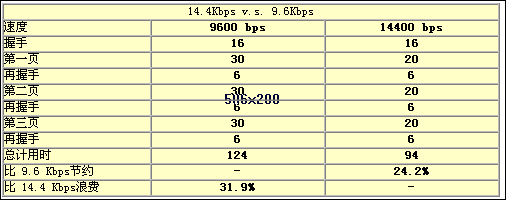 東進(jìn)傳真卡TC-04FM采用RockWell的33.6K的芯片,提供的傳真速率是 14.4Kbps,相對于 9.6Kbps,可以節(jié)約24.2%的時間(按3頁傳真計(jì)算)。各項(xiàng)操作的占用時間比較表如下: