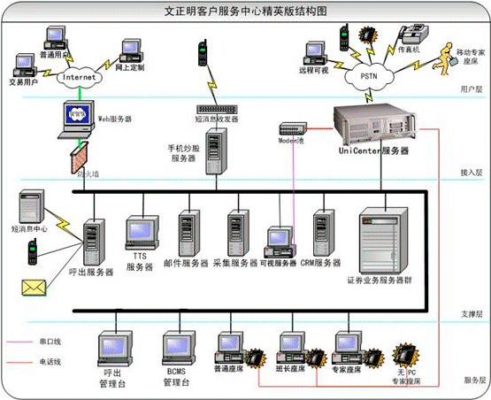 文正明的呼出系統(tǒng)可以通過(guò)電話,短信,email等各種方式主動(dòng)為股民提供服務(wù)。由于ISDN的接續(xù)速度比較快,系統(tǒng)在呼出的性能上比模擬中繼和一號(hào)方式好很多。