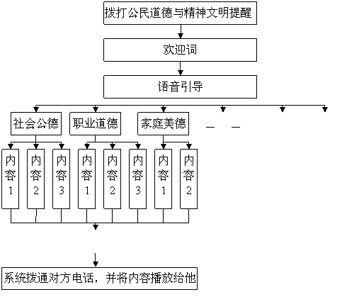 例如,某位公民對(duì)他(她)的鄰居或者同事一些不文明的行為(如深夜打麻將,亂倒垃圾,不講衛(wèi)生,破壞公物……)感到有必要進(jìn)行善意的提醒,但是,又覺(jué)得直接對(duì)他(她)說(shuō)不合適,因?yàn)楫吘闺p方很熟悉或者還要共事,如果直接對(duì)對(duì)方進(jìn)行批評(píng)可能會(huì)引起對(duì)方的反感,即使對(duì)方認(rèn)為自己做的不對(duì),也會(huì)感到很尷尬,很失面子,在這種情況下,這為公民可以撥打“社區(qū)道德與精神文明提醒熱線(xiàn)”,選取熱線(xiàn)內(nèi)預(yù)先已經(jīng)錄制好,經(jīng)過(guò)審定的錄音內(nèi)容,選取內(nèi)容后輸入對(duì)方的電話(huà)號(hào)碼,熱線(xiàn)系統(tǒng)就可以將這段錄音播放給對(duì)方聽(tīng),對(duì)方聽(tīng)到之后就會(huì)意識(shí)到或者思考自己的行為里面有沒(méi)有不文明的行為,同時(shí)會(huì)相應(yīng)的約束自己的行為。但是在此過(guò)程中對(duì)方并不知道為他(她)點(diǎn)播這段錄音的人的電話(huà)號(hào)碼,從而也不知道是誰(shuí)給她留的錄音。當(dāng)然,還可以通過(guò)電子郵件或者手機(jī)短消息的方式對(duì)他(她)進(jìn)行提醒。
