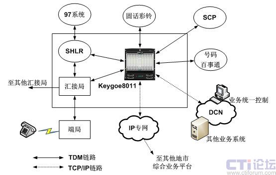 東進(jìn)Keygoe系列多媒體交換機(jī)通過高密度7號(hào)信令鏈路支持、大容量的時(shí)隙交換、多網(wǎng)絡(luò)接口和語(yǔ)音處理完成不同業(yè)務(wù)系統(tǒng)的7號(hào)信令的接續(xù)和解析、話音交換和協(xié)議轉(zhuǎn)換。對(duì)于已經(jīng)進(jìn)行固網(wǎng)智能改造的電信網(wǎng)絡(luò),可以在匯接局將各種業(yè)務(wù)平臺(tái)連接至東進(jìn)Keygoe系列多媒體交換機(jī),并通過東進(jìn)Keygoe系列多媒體交換機(jī)連接至SHLR,實(shí)現(xiàn)多業(yè)務(wù)平臺(tái)上的多業(yè)務(wù)觸發(fā),同時(shí)通過SHLR與97系統(tǒng)以及其他業(yè)務(wù)支撐系統(tǒng)連接起來,實(shí)現(xiàn)業(yè)務(wù)的統(tǒng)一批價(jià)、鑒權(quán)和計(jì)費(fèi);對(duì)于沒有進(jìn)行固網(wǎng)智能化改造的電信網(wǎng)絡(luò),可以在匯接局通過東進(jìn)Keygoe系列多媒體交換機(jī)和SSP提供基于TCP/IP層面的業(yè)務(wù)平臺(tái)互聯(lián)。
