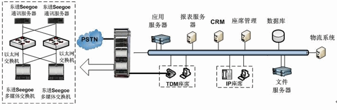 東進技術(shù)電視購物呼叫中心解決方案,采用東進技術(shù)Seegoe系列多媒體交換機和多媒體服務(wù)器搭建系統(tǒng)平臺。東進Seegoe系列多媒體交換機,具有豐富的媒體資源和強大的處理能力,并提供功能模塊的N+1全冗余備份,滿足了高負荷、大并發(fā)和關(guān)鍵業(yè)務(wù)的可靠運營。以Seegoe多媒體交換機、Seegoe通訊服務(wù)器為核心的面向業(yè)務(wù)流程的呼叫中心平臺在媒體交換層以全新的IP架構(gòu)實現(xiàn)網(wǎng)絡(luò)融合、應(yīng)用融合和業(yè)務(wù)融合。如下圖所示: