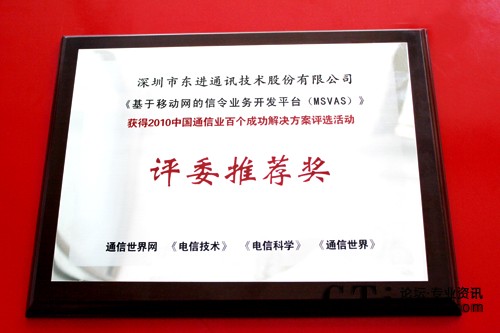從2010年7月起評選進(jìn)入征集階段,經(jīng)過長達(dá)3個月的層層篩選,最終百個成功解決方案出爐,并由多家主流媒體公示。東進(jìn)技術(shù)“基于移動網(wǎng)的信令業(yè)務(wù)開發(fā)平臺(MSVAS)”解決方案憑借出眾的實用經(jīng)濟(jì)性、安全可靠性、靈活性和成熟性,經(jīng)過兩個月網(wǎng)絡(luò)初選,和近百位運營商層面專業(yè)人士組成的組委會技術(shù)終選后獲此殊榮。