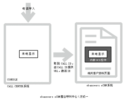 。。Ebanswers CRM整合呼叫中心的這種方式過程更清晰,當有電話呼入系統(tǒng)時,由內嵌的OCX控件取到call