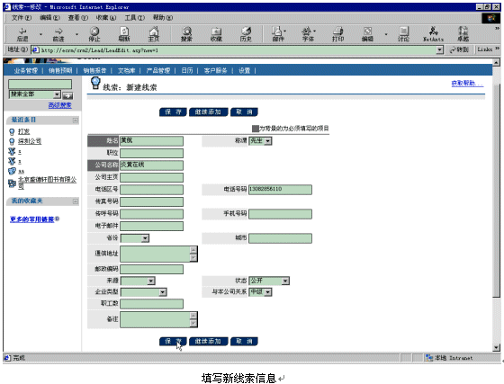 。。比如現(xiàn)在有一個新客戶黃航的電話13082856110呼入Ebanswers呼叫中心,console控制臺接收到這個電話號碼以后,會產生一個URL鏈接地址tel=217,以參數(shù)的形式附在調用的CRM頁面http://ecrm/crm2/default.asp?retURL=http://ecrm/crm2/search/searchtel_xml.asp后面,當話務員登錄以后,就會彈出相應的添加新線索頁面,話務員填寫好相關信息后,按下"保存"按鈕就可以建立新線索了。