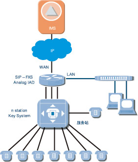適用于支持模擬線的小交換機,經SIPIAD設備將模擬線路轉換為基于IP的SIP信令流和媒體流,接入IMS系統(tǒng)。經愛立信測試認證過的IAD產品有Mediatrix、Audiocodes、Linksys等。