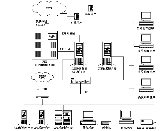在整個系統(tǒng)中北京聯(lián)訊創(chuàng)新公司承擔了奧星天網(wǎng)GPS信息服務系統(tǒng)的呼叫中心系統(tǒng)(CALL CENTER)的籌建。