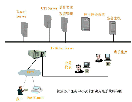 新晨客戶服務(wù)中心普及型解決方案是在以專用交換機(jī)或PC服務(wù)器加語(yǔ)音卡作為電話接入設(shè)備,如果用PC服務(wù)器加語(yǔ)音卡作為電話接入設(shè)備,將電話中繼線直接接到IVR上。此方案中的CTI系統(tǒng)能夠適用于流行的語(yǔ)音板卡和多種電話交換機(jī)的不同環(huán)境,這種解決方案主要針對(duì)小型的客戶服務(wù)中心推出。