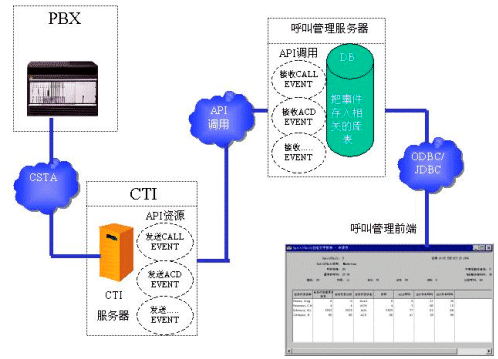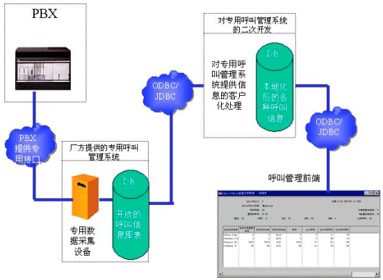 一般來說,各大有能力推出PBX產(chǎn)品的通訊廠商都有自己專用的呼叫管理系統(tǒng)。這些專用的呼叫管理系統(tǒng)可以直接從PBX獲取最高效的消息,而不用通過CTI SERVER。當(dāng)然,這些專用的呼叫管理系統(tǒng)也只能應(yīng)用于專門的PBX產(chǎn)品。 如果運(yùn)營商在選購設(shè)備的時(shí)候,已經(jīng)選購了專用的呼叫管理系統(tǒng),那么開發(fā)商可以對這個(gè)專門的呼叫管理系統(tǒng)進(jìn)行二次開發(fā)。請看下面的數(shù)據(jù)流程圖: