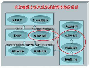 在電信增值市場開放的背景之下,新的市場價值鏈正在形成(如圖所示)。國內(nèi)電信建設轟轟烈烈的大規(guī);A設施投資已是明日黃花,改善應用“稀缺”的現(xiàn)狀才是當務之急。李峻認為,信息產(chǎn)品技術(shù)服務提供商最主要的任務,就是幫助運營商開發(fā)針對中國市場的增值業(yè)務,并帶動其主業(yè)協(xié)同發(fā)展。即面向電信網(wǎng)絡運營商以及虛擬運營商,提供增值業(yè)務系統(tǒng)整體解決方案及其軟硬件支撐平臺和應用系統(tǒng)。