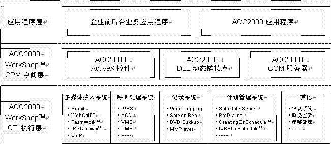 ACC2000 Workshop是聲訊科技集團(tuán)為基于Microsoft Windows操作系統(tǒng)的CRM應(yīng)用軟件開發(fā)所建立的開發(fā)平臺(中間件)。以ACC2000 Workshop為基礎(chǔ)的ACC2000集成多媒體溝通中心采用三層結(jié)構(gòu),利用ACC2000 Workshop的CRM中間層所提供的ActiveX控件、DLL動態(tài)庫以及COM組件,就可以很容易地將溝通中心的各種功能融合到前端應(yīng)用程序中。ACC2000 Workshop的CTI執(zhí)行層接受中間件發(fā)來的請求,處理ACC2000的各項服務(wù)功能,并向CRM應(yīng)用程序返回執(zhí)行結(jié)果。見下圖。