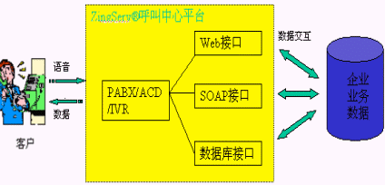 SQL Server,MySQL等多種數(shù)據(jù)庫;通過HTTP調(diào)用第三方WEB程序,通過SOAP協(xié)議調(diào)用Web Server上的服務(wù),從而利用外部應(yīng)用進(jìn)一步加強(qiáng)IVR的功能;用戶只需做一些簡單配置就可以實現(xiàn)電話訪問數(shù)據(jù)庫、WEB和業(yè)務(wù)系統(tǒng)。如圖所示: