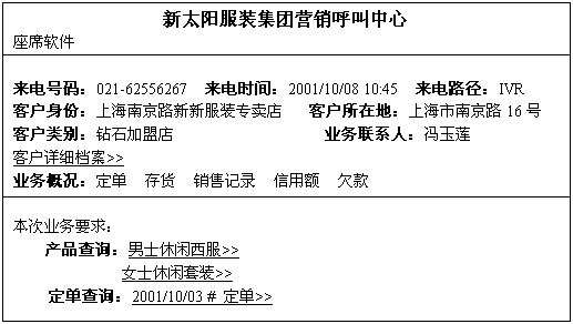 呼叫中心是以CTI技術(shù)為根本的,它的長項就在于能把計算機系統(tǒng)與電話系統(tǒng)集成起來。在呼叫中心所集成的計算機系統(tǒng)中,除了呼叫中心本身的應用軟件外,更重要的就是與ERP(企業(yè)資源計劃)系統(tǒng)集成后產(chǎn)生的功能強大的座席端應用軟件。實際上,與ERP系統(tǒng)無縫連接的座席端應用軟件,很容易就能擴充為一個簡單的CRM(客戶關(guān)系管理)系統(tǒng)。這時,呼叫中心就真正成了服裝生產(chǎn)商整個運營管理體系中的溝通樞紐和響應中心。