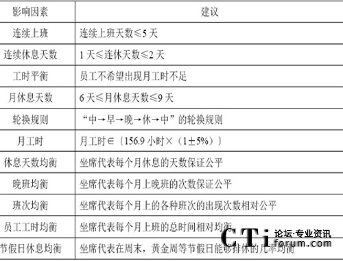 要滿足每半小時實際安排的座席數(shù)量不少于需要的座席數(shù)量的要求,首先就需要進行班次的設(shè)計,這是為第五環(huán)節(jié)資源規(guī)劃而準備的。“班次設(shè)計”是指設(shè)計出一系列的班次,比如早班,中班,晚班,等等。而將來只要告訴員工,你下個月每天各上什么樣的班次即可。在班次設(shè)計時,需要充分考慮前面提到的一些影響因素:如下所示。