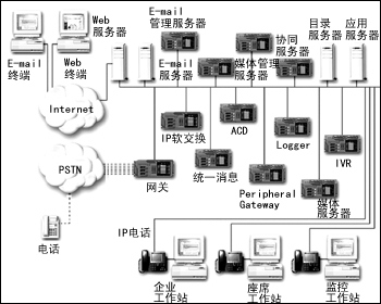 從上面的圖1、圖2中,可以看到IP通信大大簡(jiǎn)化了企業(yè)的網(wǎng)絡(luò)通信結(jié)構(gòu)。但是為了實(shí)現(xiàn)不同的功能和應(yīng)用,網(wǎng)絡(luò)中仍然存在很多的服務(wù)器,各個(gè)品牌不同功能的服務(wù)器之間的協(xié)同成為最顯著的問題,同時(shí)維護(hù)和運(yùn)行這樣大量的設(shè)備也需要大量的資源支持。而且,這僅是單點(diǎn)的客戶服務(wù)中心所需的配備,而在基于IP通信的分布式客戶服務(wù)中心的構(gòu)建中,所涉及的設(shè)備更多。