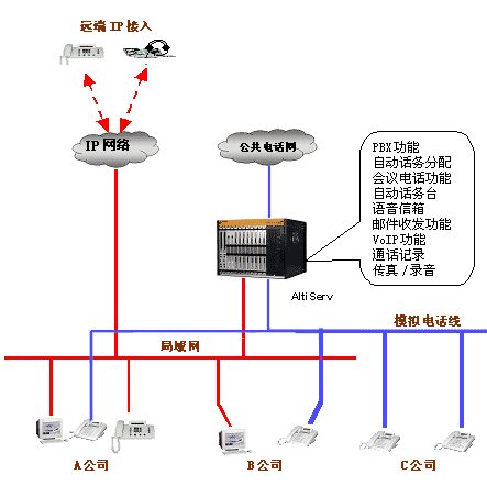 | 多個(gè)小型辦公室共享一個(gè)電話系統(tǒng)或局域網(wǎng)是一個(gè)比較經(jīng)濟(jì)選擇,現(xiàn)在很多辦公樓也是采用這種方式為大樓里的辦公室提供通訊或數(shù)據(jù)服務(wù),大大減少了租戶的通訊的投資。但是采用傳統(tǒng)的交換機(jī)也帶來(lái)很多不便。如只能有一個(gè)總機(jī),撥入的電話不知道是找哪個(gè)公司的,既增加接線員的工作,又不利樹(shù)立公司的形象。如何公平地向共用交換機(jī)的辦公室的收取電話費(fèi)也是個(gè)解決不了的問(wèn)題,因?yàn)闊o(wú)法記錄和統(tǒng)計(jì)每個(gè)辦公室的撥出的電話量。 但是采用奧迪堅(jiān)的ALTISERV,這些問(wèn)題很自然地就解決了。將每個(gè)辦公室設(shè)成一個(gè)工作組,每個(gè)工作組可以設(shè)置特定的撥入撥出電話市話號(hào)碼,對(duì)總機(jī)而言,來(lái)電時(shí)的桌面顯示公司名,或者通過(guò)多個(gè)自動(dòng)話務(wù)臺(tái)直接轉(zhuǎn)入工作組。 對(duì)于撥出電話,只能通過(guò)事先設(shè)定電話進(jìn)入市話網(wǎng)。這樣,這個(gè)電話的全部費(fèi)用都由這個(gè)公司。 此外,共享的辦公室及其員工都可以使用ALTISERV提供的全部功能,就好象這個(gè)辦公室建了一個(gè)專門的網(wǎng)絡(luò)電話系統(tǒng)一樣。 接線圖如下: |