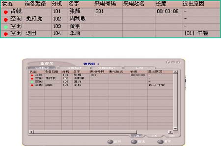 班長(zhǎng)席子系統(tǒng)除了話務(wù)席子系統(tǒng)中所介紹的全部功能外,還具有監(jiān)聽、錄音、強(qiáng)拆電話、攔截呼叫、話務(wù)席監(jiān)控、話務(wù)工作量統(tǒng)計(jì)等座席管理功能。