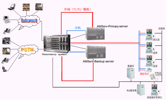 奧迪堅(jiān)通訊系統(tǒng)有限公司作為CTI通訊平臺的提供商,在技術(shù)上不斷創(chuàng)新,對產(chǎn)品精益求精,尤其體現(xiàn)在對系統(tǒng)的運(yùn)行安全性的要求上,為了防止電信接入設(shè)備或者企業(yè)網(wǎng)絡(luò)出現(xiàn)故障而造成的呼叫中心服務(wù)中斷,奧迪堅(jiān)呼叫中心系統(tǒng)提供安全保護(hù)冗余切換系統(tǒng),來保障呼叫中心在意外情況下的正常工作,該安全冗余切換系統(tǒng)通過對電源、T1/E1、模擬trunk、分機(jī)座席、以及各種網(wǎng)絡(luò)鏈路串口等備份切換來實(shí)現(xiàn)可靠的運(yùn)行。除此之外,奧迪堅(jiān)系統(tǒng)本身也提供強(qiáng)大的安全保障,由于采用先進(jìn)IP內(nèi)核一體化設(shè)計(jì),集傳統(tǒng)PBX、CTI服務(wù)器、IVR、ACD、Recording、FAX等眾多設(shè)備于一體,這樣有效的避免了因?yàn)橥鈷煸O(shè)備過多以及設(shè)備供應(yīng)商的不同而存在的兼容性的問題,從而降低了給呼叫中心系統(tǒng)帶來的的不穩(wěn)定的安全隱患。在系統(tǒng)之外依靠安全保護(hù)冗余切換系統(tǒng),可以實(shí)現(xiàn)外線、分機(jī)、以及各種鏈路接口的雙倍安全運(yùn)行。如上圖所示:兩臺奧迪堅(jiān)的呼叫中心服務(wù)器和奧迪堅(jiān)安全冗余切換系統(tǒng)構(gòu)成呼叫中心熱備份系統(tǒng),在兩臺服務(wù)器中安裝所有的呼叫中心功能模塊。通常情況下由主呼叫中心服務(wù)器提供系統(tǒng)的正常運(yùn)行,備份服務(wù)器通過安全保護(hù)冗余切換系統(tǒng)的服務(wù)監(jiān)測模塊來監(jiān)測主服務(wù)器的各項(xiàng)設(shè)備和鏈路的使用情況,當(dāng)主服務(wù)器遭遇突發(fā)故障不能繼續(xù)工作時(shí),系統(tǒng)馬上實(shí)施自動切換,就會通過安全保護(hù)冗余切換系統(tǒng)將系統(tǒng)切換到備份的呼叫中心系統(tǒng)上來,此鏈路可以是數(shù)據(jù)、語音、網(wǎng)絡(luò)、串口等。當(dāng)安全保護(hù)冗余切換系統(tǒng)自身出現(xiàn)斷電或者其他故障時(shí),所有鏈路均保持正常工作狀態(tài)。