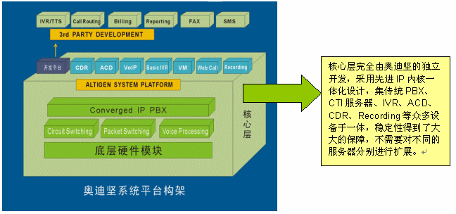 值得一提的是,在穩(wěn)定性上,奧迪堅(jiān)IP一體化呼叫中心平臺(tái)系統(tǒng)構(gòu)架,從產(chǎn)品設(shè)計(jì)之初就突破了以住基于交換機(jī)或板卡的傳統(tǒng)模式,在一臺(tái)通訊服務(wù)器上高度融合了呼叫中心的所有常用功能,有效避免了復(fù)雜的網(wǎng)絡(luò)連接和眾多的各類交換機(jī)和外掛設(shè)備,各個(gè)設(shè)備相對(duì)獨(dú)立兼容性差所給呼叫中心系統(tǒng)所帶的穩(wěn)定性欠佳的隱患。除此之外,奧迪堅(jiān)呼叫中心系統(tǒng)底層硬件模塊是在美國(guó)設(shè)計(jì)生產(chǎn)的,通過北美和中國(guó)的嚴(yán)格的電信入網(wǎng)測(cè)試;相對(duì)于硬件,平臺(tái)軟件也都是由奧迪堅(jiān)自主開發(fā)設(shè)計(jì)的,針對(duì)不同的硬件采用不同的驅(qū)動(dòng)模塊,軟硬一體在交換層又使用統(tǒng)一的邏輯接口,結(jié)構(gòu)清晰,層次合理,不僅保障了穩(wěn)定而且便于擴(kuò)展(如下圖所示),整個(gè)系統(tǒng)作為一個(gè)整體統(tǒng)一擴(kuò)展,不需要對(duì)不同的服務(wù)器分別進(jìn)行擴(kuò)展,有效避免了傳統(tǒng)呼叫中心構(gòu)建方式在擴(kuò)展方面存在的復(fù)雜性問題以及高額的擴(kuò)展費(fèi)用。