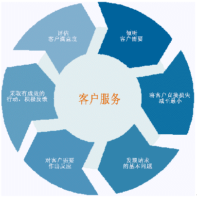 客戶服務(wù)不僅限于把公司提供給客戶使用?蛻舴⻊(wù)是與客戶交互的一個(gè)完整過(guò)程,包括聽(tīng)取客戶的問(wèn)題和要求,對(duì)客戶的需要作出反應(yīng)并探詢客戶新的需求。我們真的不能將其看成一個(gè)簡(jiǎn)單的過(guò)程。客戶服務(wù)可以用一個(gè)復(fù)雜的循環(huán)來(lái)表示,其中不僅僅包括了客戶和客戶服務(wù)部門,實(shí)際上包括了整個(gè)公司,即把公司整體作為一個(gè)受客戶需求驅(qū)動(dòng)的對(duì)象。