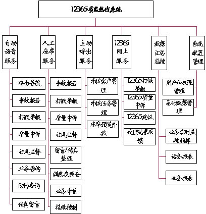 系統(tǒng)主要功能有:事故報告、打假舉報、質(zhì)量申訴、行風監(jiān)督、業(yè)務咨詢、防偽查詢、主動呼出、網(wǎng)上服務、統(tǒng)計分析、數(shù)據(jù)匯總監(jiān)控等。