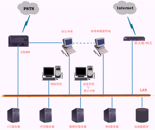LTD4000客戶服務(wù)中心主要由LTD-09可編程智能語音交換機(jī)、業(yè)務(wù)代表座席、CTI服務(wù)器、數(shù)據(jù)庫服務(wù)器、WEB服務(wù)器、管理監(jiān)控工作站和網(wǎng)絡(luò)連接設(shè)備等部分組成。