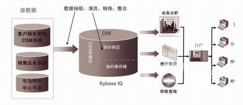 利用Sybase IQ的產(chǎn)品優(yōu)勢,我們將客戶服務(wù)管理系統(tǒng)、銷售業(yè)務(wù)系統(tǒng)、華為呼叫中心平臺的各種異構(gòu)數(shù)據(jù)庫數(shù)據(jù),通過 IQ 提供的直接數(shù)據(jù)訪問方式,逐步實(shí)施對數(shù)據(jù)的抽取、轉(zhuǎn)換及加載(ETL),最終整合到