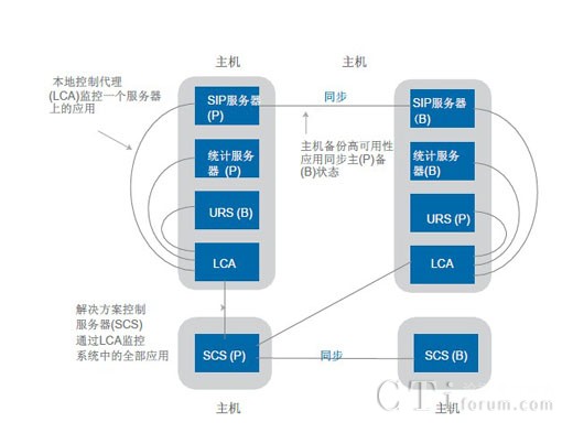 除了提供多個(gè)解決方案組件級(jí)的高可用性之外,高可用性功能也被融入到了管理框架中。圖4作為假設(shè)系統(tǒng)配置顯示了Genesys系統(tǒng)中高可用性管理的幾個(gè)重要方面。通過(guò)此類架構(gòu),解決方案控制服務(wù)器(SCS)管理著系統(tǒng)中所有Genesys組件的服務(wù)狀態(tài),包括啟動(dòng)和停止組件以及管理它們的高可用性主/備狀態(tài)等。SCS與本地控制代理(LCA)的多個(gè)實(shí)例共同運(yùn)行。每個(gè)物理主機(jī)上面都安裝有LCA的一個(gè)實(shí)例,用于在SCS與主機(jī)上面安裝的單個(gè)組件之間提供接口。