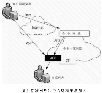 互聯(lián)網(wǎng)呼叫中心是在互聯(lián)網(wǎng)技術(shù)飛速發(fā)展的基礎(chǔ)上所產(chǎn)生的。對于客戶而言,完全的互聯(lián)網(wǎng)呼叫中心和傳統(tǒng)呼叫中心最大的區(qū)別就在于客戶無需電話,只要從一個Web站點(diǎn)就可以直接進(jìn)入互聯(lián)網(wǎng)呼叫中心。這樣一來,呼叫中心就從傳統(tǒng)形式上的“撥號-交談(Dial to Talk)”發(fā)展到現(xiàn)代形式的“點(diǎn)擊-交談(Click to Talk)”。典型的互聯(lián)網(wǎng)呼叫中心結(jié)構(gòu)如圖1所示。