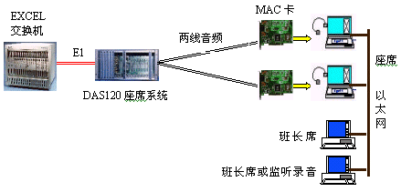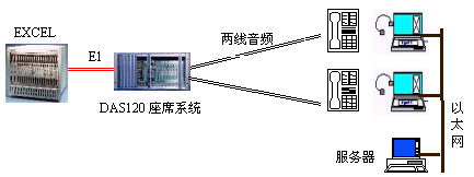 因?yàn)镋XCEL交換機(jī)不能提供模擬接口。DAS120的出現(xiàn)很好地彌補(bǔ)了其不足。它與EXCEL交換機(jī)采用4個E1連接,可以簡潔實(shí)現(xiàn)PCM信號轉(zhuǎn)模擬信號引出到座席。E1接口的信令可選配為隨路信令CAS和透明通道Clear
