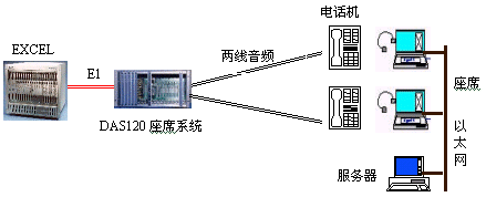見下圖:DAS120主機(jī)通過4個E1接口與交換機(jī)直接連接,可方便地實(shí)現(xiàn)本地座席接入。遠(yuǎn)端分布式接入則需要通過傳輸設(shè)備,它們可為光纖,微波,HDSL等。終端可為座席卡和電話機(jī)。